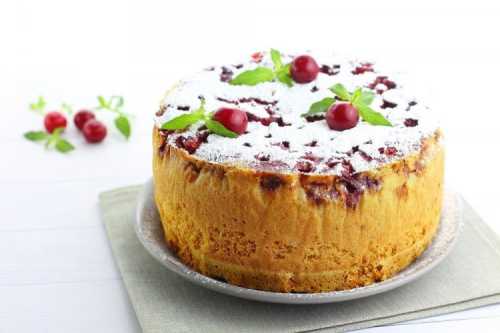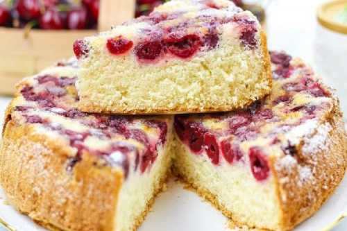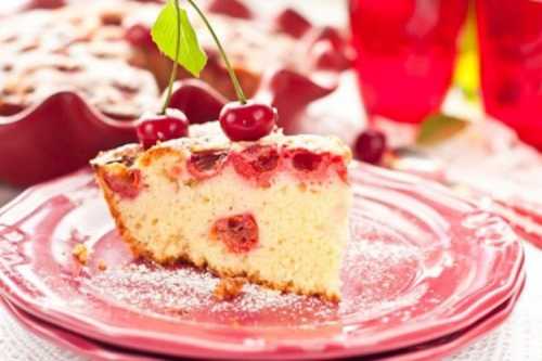 Тобі знадобиться: 4 яйця, 280 г борошна, 120 мл жирних вершків, 100 мл молока, 0,5 ч.л. розпушувача, 180 г цукру, сіль на кінчику ножа, 200 г вишні.