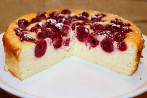 Тобі знадобиться: 4 яйця, 100 г борошна, 300 г сиру, 0,5 ч.л. соди, 1 ст. манки, 1 склянка цукру, ванілін на кінчику ножа, 150 г вишні.