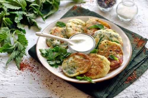 Опусти кропиву, шпинат і зелену цибулю в окріп на кілька хвилин, обсуши і подрібни. Збий яйця з молоком, приправ і додай борошно, що просіює, з розпушувачем. Перемішай тісто, додай усю зелень і обсмаж оладки на сковороді з двох боків до рум'яності.