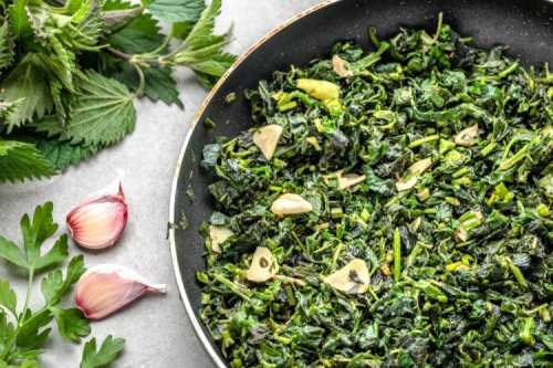 Приготування: Промий і довільно наріж кропиву. Обсмажити подрібнений часник на олії пару секунд, додай кропиву і тушкуй разом 10-15 хвилин, помішуючи. Приправ за смаком.
