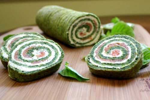 Виклади масу на пергамент шаром завтовшки близько 15 мм. Відправте в духовку на 12-15 хвилин при 190 градусах. Дістань пласт, зверни його в рулет і залиш на 5-7 хвилин. Після чого розгорни, змасти вершковим сиром, присип кропом і виклади червону рибу. Знову зверни рулет, відправ його на пару годин в холодильник і наріж.