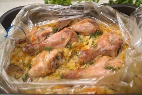 Приготування: Наріж капусту і овочі, натріть курячі ніжки спеціями і склади все в рукав. Додай олію та відправте блюдо в духовку на 1 годину при 180 градусах.