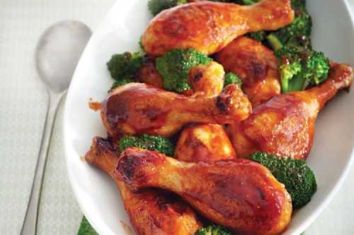Тобі знадобиться: 700 г курячих ніжок, 1 качан броколі, 2 ст.л. соєвого соусу, 2 ст.л. оливкової олії, спеції.