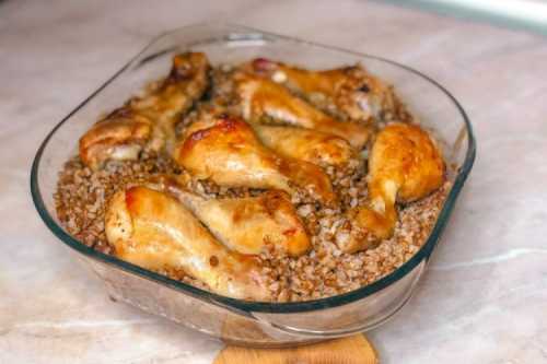 Приготування: Подрібни цибулю та моркву, і обсмаж до м'якості на олії. Додай часник та спеції. Натрію курячі ніжки спеціями. Змасти форму олією і виклади овочі, потім – промиту гречку, і залий все водою. Виклади курячі ніжки, накрийте все фольгою і запікайте 1 годину в духовці при 180 градусах. Зніміть фольгу за 15 хвилин до кінця.
