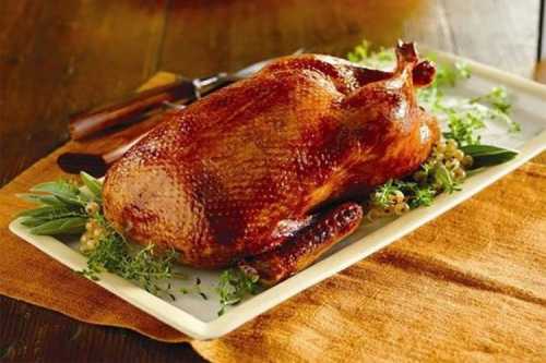 Приготування: Підготовлену качку облий хересом і прибери на 12 годин у холодильник. Рис відваріть до готовності, подрібнені цибуля і морква обсмаж на маслі, родзинки ошпаримо окропом. Все змішай, додай до смаку сіль та спеції.