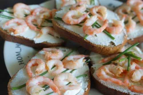 Приготування: Змасти крекери вершковим сиром. Відвари або обсмаж креветки на свій смак, очисти та виклади зверху. Посип рубаним кропом.