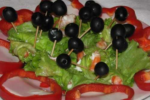 Приготування: Змішай майонез, тертий пармезан і часник. Змасти цим соусом салатне листя, а зверху поклади варену креветку і смужку перцю. Загорни все в рулетки, прикрась маслинами та закріпи шпажками.