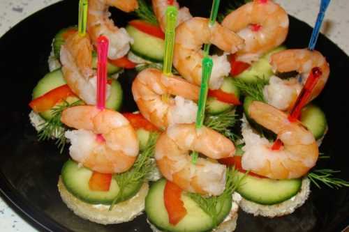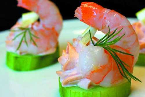 Приготування: Очисти креветки та обсмаж до готовності. Наріж хліб на невеликі скибочки, і на кожен поклади по кружечку огірка. Потім – кубик плавленого сиру та креветку. Скріпи все шпажками і прикрась зеленню.