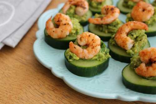 Приготування: Замарин креветки в олії та спеціях, і обсмаж до готовності. Збий у блендері авокадо, кінзу та сік лайма. Приправ масу за смаком. Наріж огірки кружальцями, виклади авокадо і зверху – креветки.