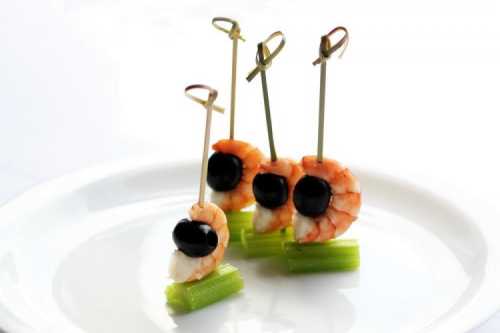 Приготування: Змішай креветки з лимонним соком, каррі та паприкою, залиш на півгодини і обсмаж до готовності. Очисти селеру від жорсткого верхнього шару і наріж брусочками. Збери селера, креветки та маслини на шпажки.
