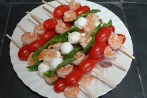 Приготування: Відвари та очисти креветки. Розріж помідори на часточки і дістань м’яку середину, щоб залишилися стійкі човники. На кожну поклади шматочок базиліка, кульку моцарелли, креветку та маслину. Закріпи шпажками.