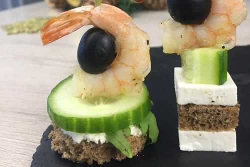 Приготування: Наріжте хліб на канапе і підсмажте його на сковороді. Обсмажити креветки до готовності. Збери канапе на шпажки – хліб, сир, креветка та кружальце огірка.