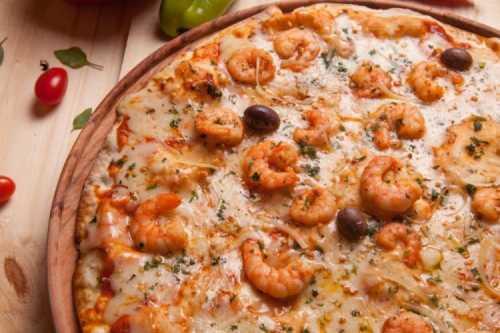 Виклади нарізаний помідор та оливки, присип тертою моцарелою та зверху виклади очищені креветки. Посип піцу пармезаном, що залишився, і випікай її в духовці 20 хвилин при 200 градусах.