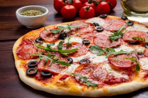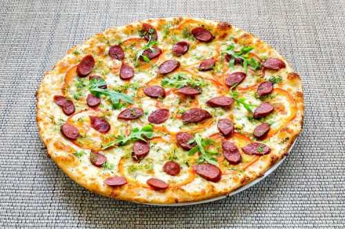 Приготування: Змішай сухі інгредієнти для тіста, додай теплу воду та олію та заміси. Розкатай тісто і змасти його томатним соусом. Наріж ковбаски кружальцями, а цибуля та перець – кільцями, і розклади їх. Засип все тертою моцарелою і випікай піцу 15 хвилин при 220-250 градусах. Перед подачею посип її свіжою руколою.
