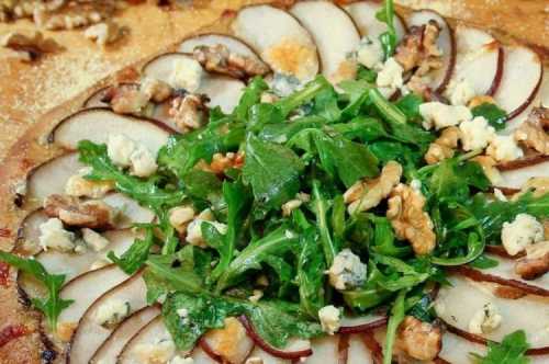 Змасти оливковою олією і розклади скибочки моцарелли. Потім – тонкі шматочки груші та посип все горгонзолою, тертим пармезаном та горішками. Відправте піцу на 20-25 хвилин в духовку при 220 градусах.