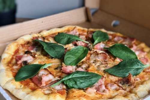 Злегка обсмаж шпинат до м'якості. Тонко наріж шинку і моцарелу. Замісити тісто з усіх інгредієнтів, розкатай, змасти його томатним соусом і посип травами. Гарно розклади начинку та випікай піцу 15-20 хвилин у духовці при 220 градусах.