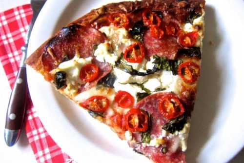 Приготування: Заміси однорідне тісто з усіх інгредієнтів і тонко розкатай його. Змасти томатним соусом, посип спеціями та травами. Зверху засип соус тертою моцарелою і довільно розклади нарізану начинку. Випікай піцу в духовці близько 15 хвилин|мінути| при 220 градусах.
