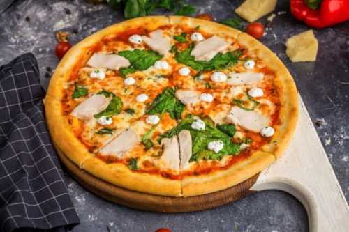 Курку тонко наріж і обсмаж до готовності в спеціях . Змасти основу для піци кетчупом та майонезом, виклади половину моцарелли і потім – курку з нарізаними овочами. Виклади моцареллу, що залишилася, посип піцу зеленню і випікай її в духовці 15-20 хвилин при 200 градусах.