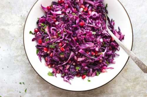 Тобі знадобиться: 1/2 качана червонокачанної капусти, 1 яблуко, 1/2 фіолетової цибулини, 100 г зерен гранату, 30 г волоських горіхів, 5 ст.л. оливкової олії, 2 ст.л. лимонного соку, 0,5 ч.л. цукру та діжонської гірчиці, спеції.