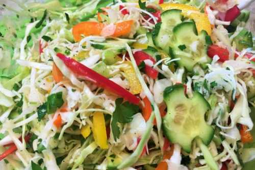 Приготування: Тонко нашаткуй капусту і наріж овочі соломкою. Змішай оливкову олію, яблучний оцет і цукор і заправ салат.