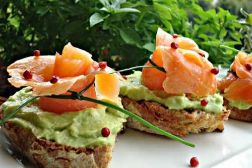 Приготування: Обсмаження скибочки багету з двох сторін на сухій сковороді. Розімні м'якоть авокадо з невеликою кількістю оливкової олії, лимонного соку та спецій. Змасти брускетти намазкою з авокадо, додай шматочки слабосоленого лосося, а потім прикрась закуску зеленню за смаком.