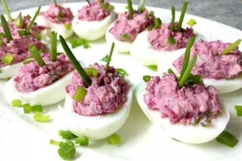 Приготування: Заздалегідь відвари яйця та буряки, а потім очисти і розріж яйця навпіл. Натрій буряк на тертці, дрібно наріж оселедець, подрібни зелень і розітри жовтки вилкою. Змішай начинку, приправ, заправ її майонезом і нафаршируй нею половинки білків.