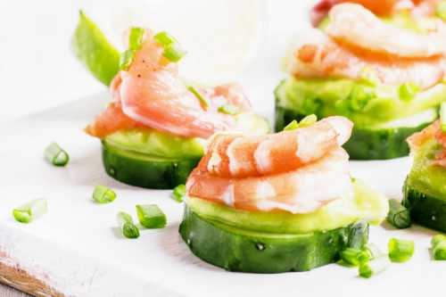 Приготування: Наріж огірки кружальцями по 2-3 см завтовшки і виріж у них серединки. Розімні м'якоть авокадо і змішай її з дрібно нарізаним лососем та майонезом. Наповни огірки цією начинкою та прикрась вареними креветками.