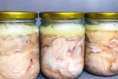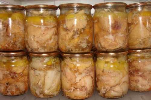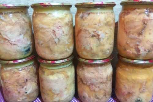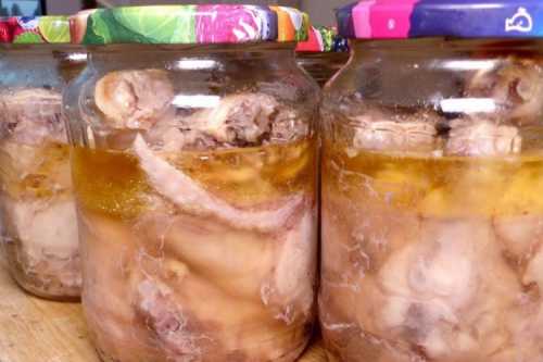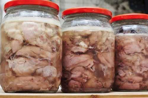 Розведи желатин у невеликій кількості бульйону, влий його в бульйон, що залишився, і залий їм тушонку. Накрийте банки кришками і стерилізуйте 1,5 години в киплячій воді. Захід на зиму.