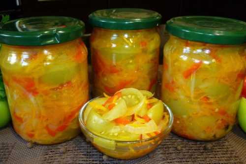 Тобі знадобиться: 1,2 кг болгарського перцю, 800 г моркви, 10 зелених помідорів, 6 цибулин, 2 ст. солі, 2 ч. л. цукру, 200 мл олії, 200 мл оцту, спеції.