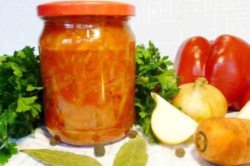 Тобі знадобиться: 1 кг болгарського перцю, 1 кг моркви, 1 кг помідорів, 1 кг капусти, 1 кг цибулі, 150 г цукру, 3 ст. солі, 300-350 мл олії, 200 мл оцту.
