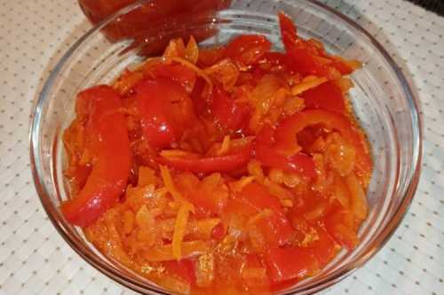 Тобі знадобиться: 2 кг болгарського перцю, 2 кг моркви, 2 кг цибулі, 1 л томатного соусу, 8 ст. цукру, 2 ст. солі, 500 мл олії, 100 мл оцту.