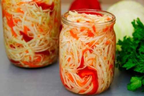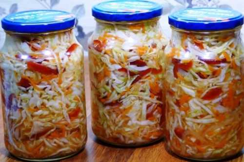 Приготування: Наріж капусту, натрій моркву і тонко наріж болгарський перець. Закип'яти воду з сіллю, цукром, олією та оцтом. Залий овочі маринадом і залиш на кілька годин. Після чого щільно поклади салат у чисті сухі банки, простерилізуйте всі 15 хвилин і заходьте на зиму.