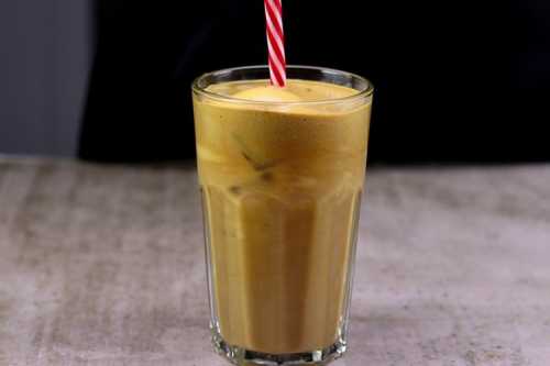 Приготування: Звари кави будь-яким зручним способом. Вилий у блендер молоко, додай цукор і влий каву. Ретельно збий все до пишності кілька хвилин і перелий у келих з льодом.