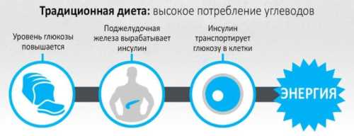 При звичному харчуванні ми підтримуємо щоденну активність за допомогою вуглеводів. Поступаючи в організм, вони підвищують рівень глюкози і запускають процес вироблення інсуліну в підшлунковій залозі. Глюкоза є безпосереднім джерелом енергії. Інсулін ж потрібно для її поширення всередині всього тіла через кровоносну систему. Таким чином, жири, що надходять з їжею, залишаються незатребуваними і накопичуються у вигляді зайвої ваги.
