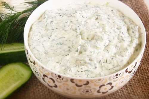 Приготування: Дрібно наріж або натрій огірки на тертці. Подрібни зелень і часник, змішай все з йогуртом і приправ готовий соус.