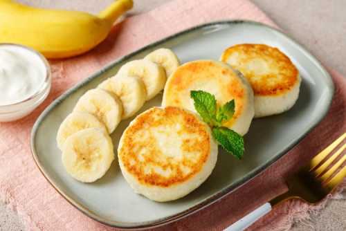 Тобі знадобиться: 500 г сиру, 1 банан, 1 яйце, 120 г манки, 50 г борошна, цукор.