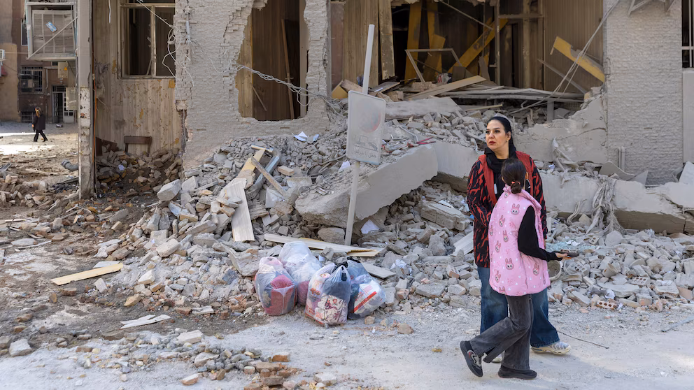 Жінка з дитиною йдуть повз зруйнований будинок, який зазнав обстрілу кілька днів тому, під час американо-ізраїльської військової операції 4 березня 2026 року в Тегерані, Іран. Маджид Саїді/Getty Images