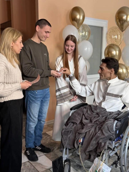 У Національному Науковому Центрі хірургії та трансплантології імені О.О.Шалімова взяли шлюб тяжкопоранений воїн Денис та Мілена. Вони зустрілися в Краматорську, де Денис зазнав мінно-вибухової травми, що спричинила ампутацію нижніх кінцівок та руки.
